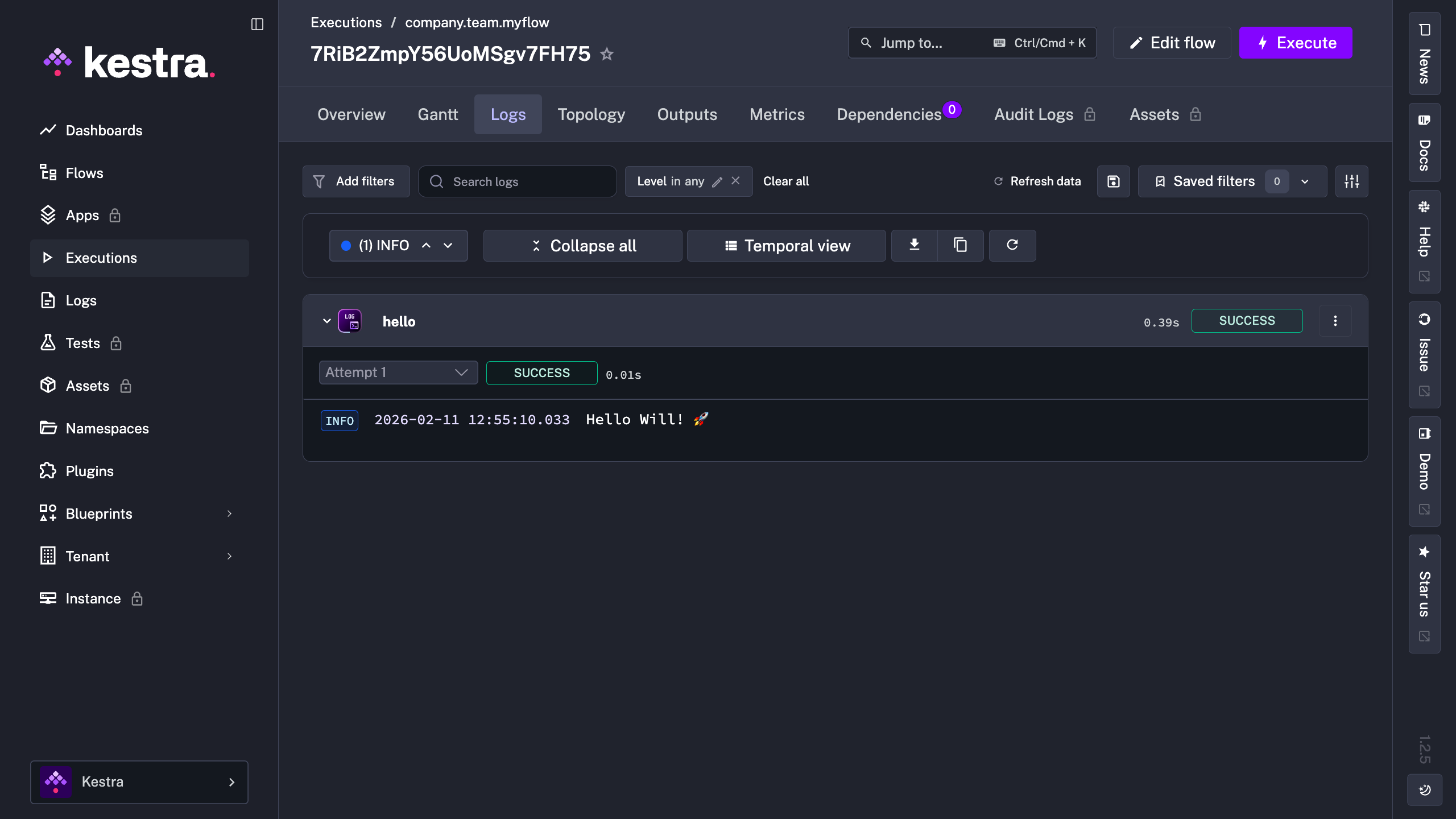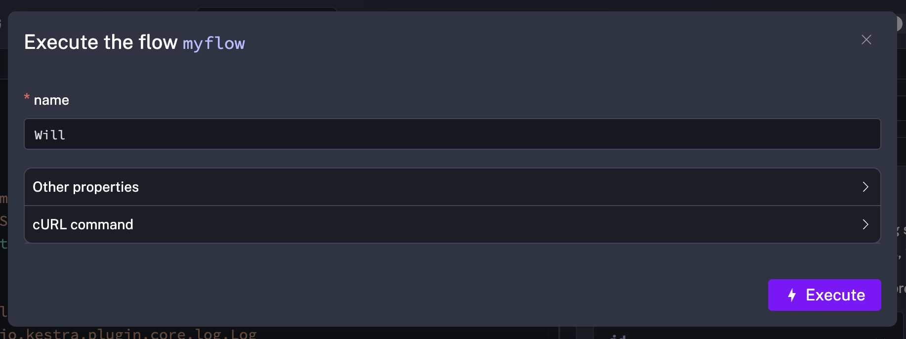 When you click Execute on a flow with inputs, Kestra presents a form where you can enter or modify the input values: