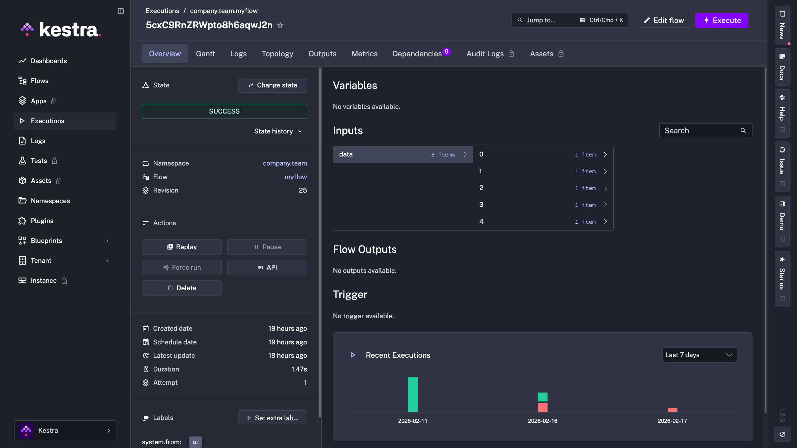 An Execution is a single run of your flow — your workflow in action, performing the steps you've defined. Every time you click Execute or a trigger fires, Kestra creates a new execution. Think of it like pressing play on your workflow: the execution is the recording of everything that happened during that run.